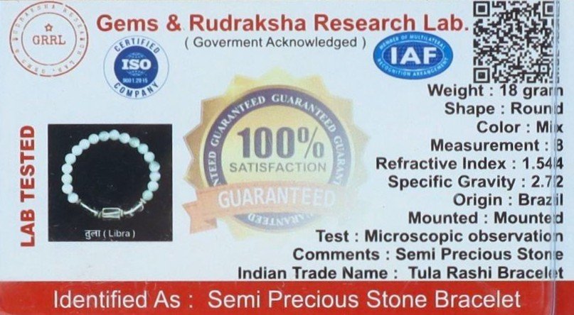- तुला राशि ब्रेसलेट उच्च गुणवत्ता वाले अर्ध-कीमती रत्नों से बना एक संतुलन और आकर्षण बढ़ाने वाला रत्न है, जो तुला राशि के सौम्य, न्यायप्रिय और कलात्मक व्यक्तित्व को सशक्त करता है।